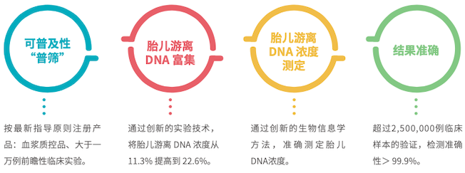 在广东省妇幼保健院、南京市妇幼保健院、浙江大学医学院附属妇产科医院、郑州大学第三附属医院完成了10,818例前瞻性临床样本的验证研究,与染色体核型分析结果和出生随访结果对比,其灵敏度为100%,特异性为99.91%,总符合率为99.91%。试剂盒已于2020年8月取得医疗器械注册证(医疗器械注册证号:国械注准20203400708)。 截至现在,已完成超过400万例临床样本的筛查,避免了多个家庭的异常患儿出生,为出生缺陷防控做出了突出贡献。