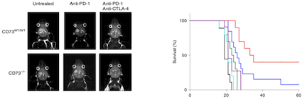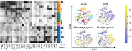 2019年12月,Nature Medicine发表对免疫检查点治疗效果好和不好的5种癌症类型,共94例患者进行单细胞蛋白和单细胞RNA测序,在多形性胶质母细胞瘤中发现了一个独特的CD73hi巨噬细胞群,在抗PD-1治疗后仍然存在。顺利获得构建CD73敲除鼠发现CD73的缺失提高了抗CTLA-4和抗PD-1治疗的多形性胶质母细胞瘤小鼠模型的存活率。证实CD73是一种特异性的免疫治疗靶点,可提高多形性胶质母细胞瘤免疫检查点治疗的抗肿瘤免疫应答。