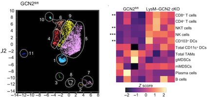 2019年12月,Science Immunology发表对黑色素瘤患者进行单细胞蛋白和单细胞RNA测序,发现肿瘤微环境的变化:巨噬细胞和髓样抑制细胞的促炎性活化的增加,肿瘤内CD8+T细胞中的干扰素-γ表达。GCN2顺利获得促进转录因子CREB-2/Atf4的翻译增加而改变了髓样抑制细胞的功能,其中CREB-2/Atf4是小鼠和人类中巨噬细胞和髓样抑制细胞成熟所必需的,而且利用小干扰RNA靶向Atf4可降低肿瘤生长,揭示免疫肿瘤学潜在的治疗靶点GCN2在肿瘤免疫反应中的作用。