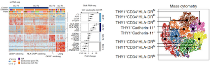 2019年5月,Nature Immunology报道关于类风湿性关节炎(RA)的研究。作者对来自RA或骨关节炎(OA)患者的51个滑膜组织样品的T细胞、B细胞、单核细胞和成纤维细胞进行单细胞RNA测序(scRNA-seq)、质谱流式检测、 转录组测序(bulk RNA-seq)和普通流式细胞检测。利用基于5,265个scRNA-seq图谱典型相关分析的综合策略,作者鉴定了18个独特的细胞群。顺利获得在单细胞层面对跨数据模态进行整合,精确定义了特定细胞亚群在RA和慢性炎症中的作用。
