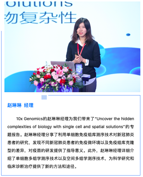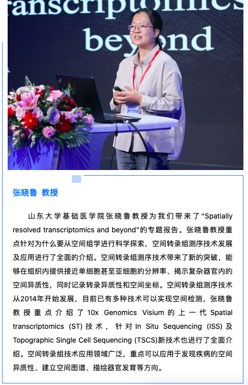 清华大学医学院研究员、博士生导师,生物芯片北京国家工程研究中心常务副主任,博奥生物集团有限公司高级副总裁,北京博奥晶典生物技术有限公司总裁邢婉丽女士为本次会议进行了开幕式致辞。邢婉丽总裁表示单细胞测序技术及空间转录组技术在科学生命和医学研究领域的应用日益受到关注,为高分辨率研究细胞分群和组织功能研究给予重要的支撑,对发现组学间关系、记录动态生物活动具有非常重要的意义,为科学界和医学界更加深入地去认识生命的本质,解析胚胎发育过程、肿瘤发生开展、新冠肺炎免疫机制、发现新的生物标志物和治疗靶点等给予全新而绚烂的研究视角。邢婉丽总裁对所有报告嘉宾及参会嘉宾的到来表示热烈欢迎及衷心感谢!