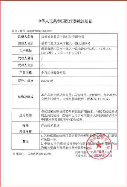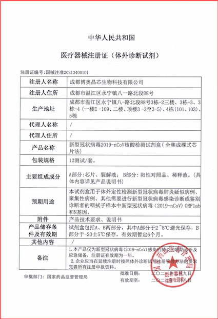 2021年2月10日,恰逢新春佳节来临之际,依托国家科技部应急攻关项目,博奥联合清华大学成功研发的由新型冠状病毒2019-nCoV核酸检测试剂盒(全集成碟式芯片法)(国械注准:20213400101)和全自动核酸分析仪(国械注准:20213220102)组成的全集成芯片实验室获国家药监局应急审批批准,为全国新冠肺炎疫情防控给予现场快速检测“芯”利器。
