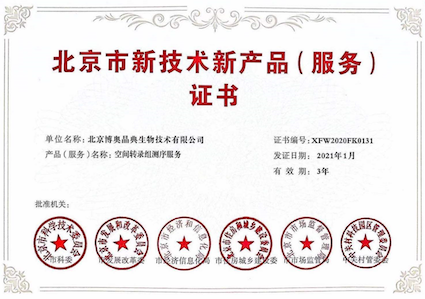 “北京市新技术新产品(服务)认定”旨在有助于高新技术产业的开展,作为北京市新技术新产品,应拥有自主知识产权,并具有技术先进性和创新性。本次喜获“空间转录组测序服务”荣誉证书是各委员会对博奥晶典创新能力的高度赞扬和肯定,同时体现了博奥晶典空间转录组测序服务在行业内的技术优势。