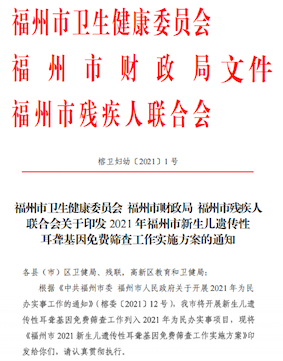 福州市新生儿耳聋基因筛查项目将在5月1日于指定采血组织全面展开,筛查对象为在福州市指定采血组织出生的常住人口新生儿(筛查对象需给予父母一方的身份证、户口簿或居住证复印件),采用耳聋基因芯片检测技术,对新生儿四个常见耳聋基因的15 个突变位点进行检测。联合物理听力筛查,准确做出耳聋病因分析,提出早期干预措施,减少听力疾病儿童的发生率,真正实现“早发现、早诊断、早干预”,达到有效预防出生缺陷的目标,减轻家庭和社会负担,促进社会和谐开展。